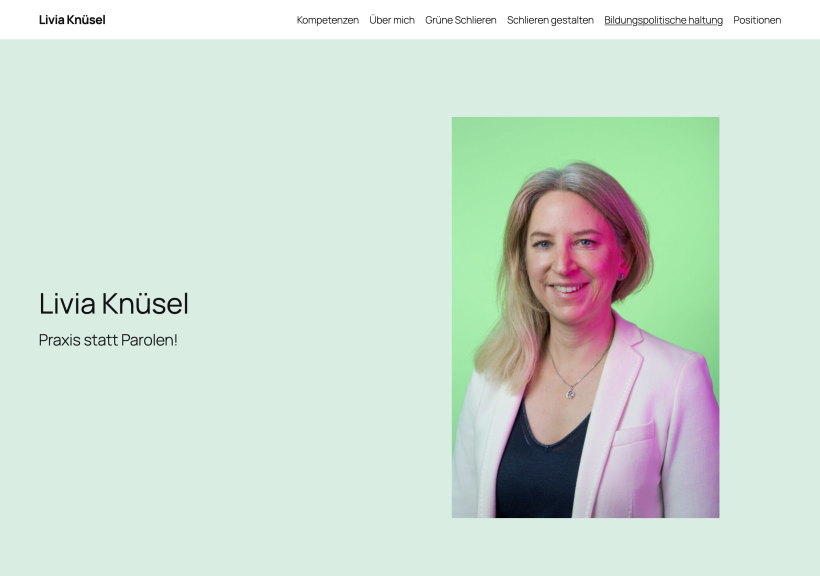 Die Grüne Kandidatin Livia Knüsel kandidiert für den schlieremer Stadtrat. Für diese Gelegenheit haben wir eine einfache Webseite erstellt, welche klar über die Politikerin informiert und das Profil öffentlich macht.